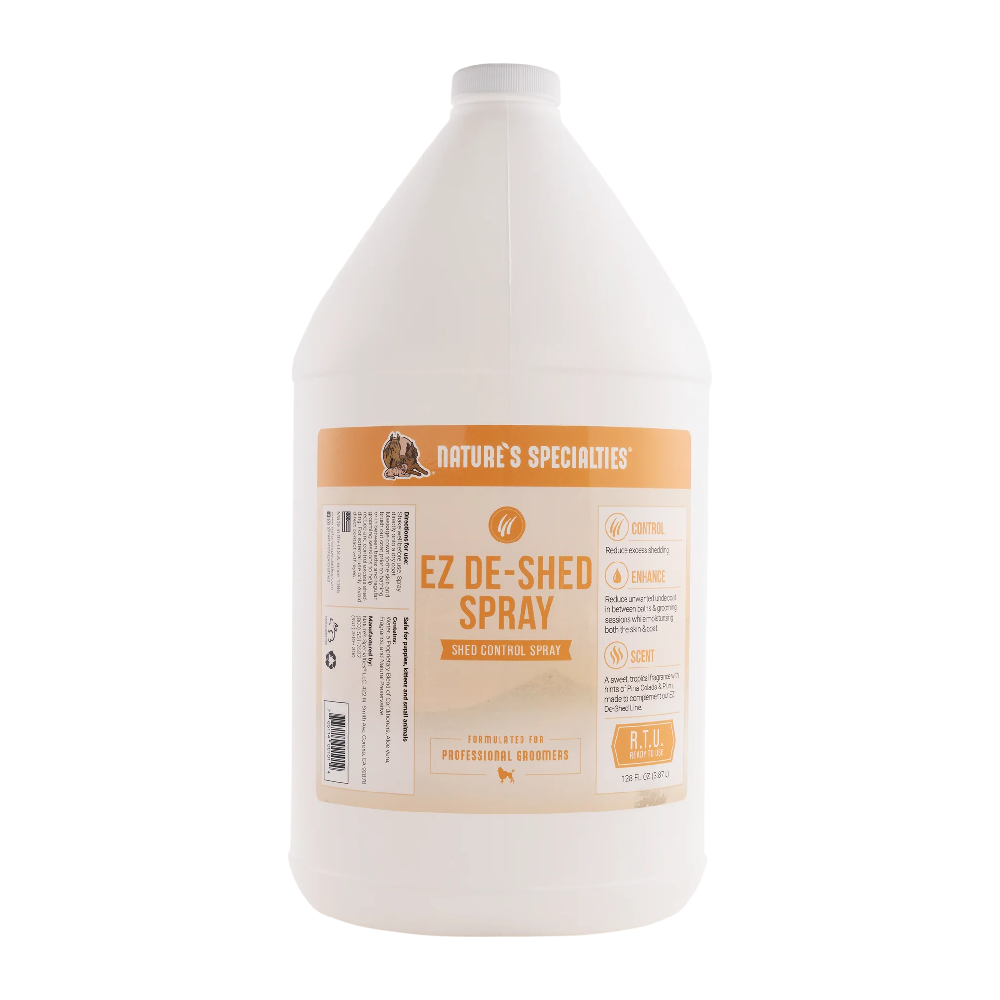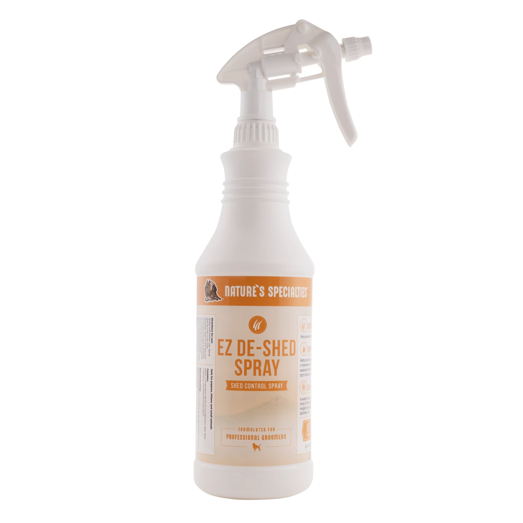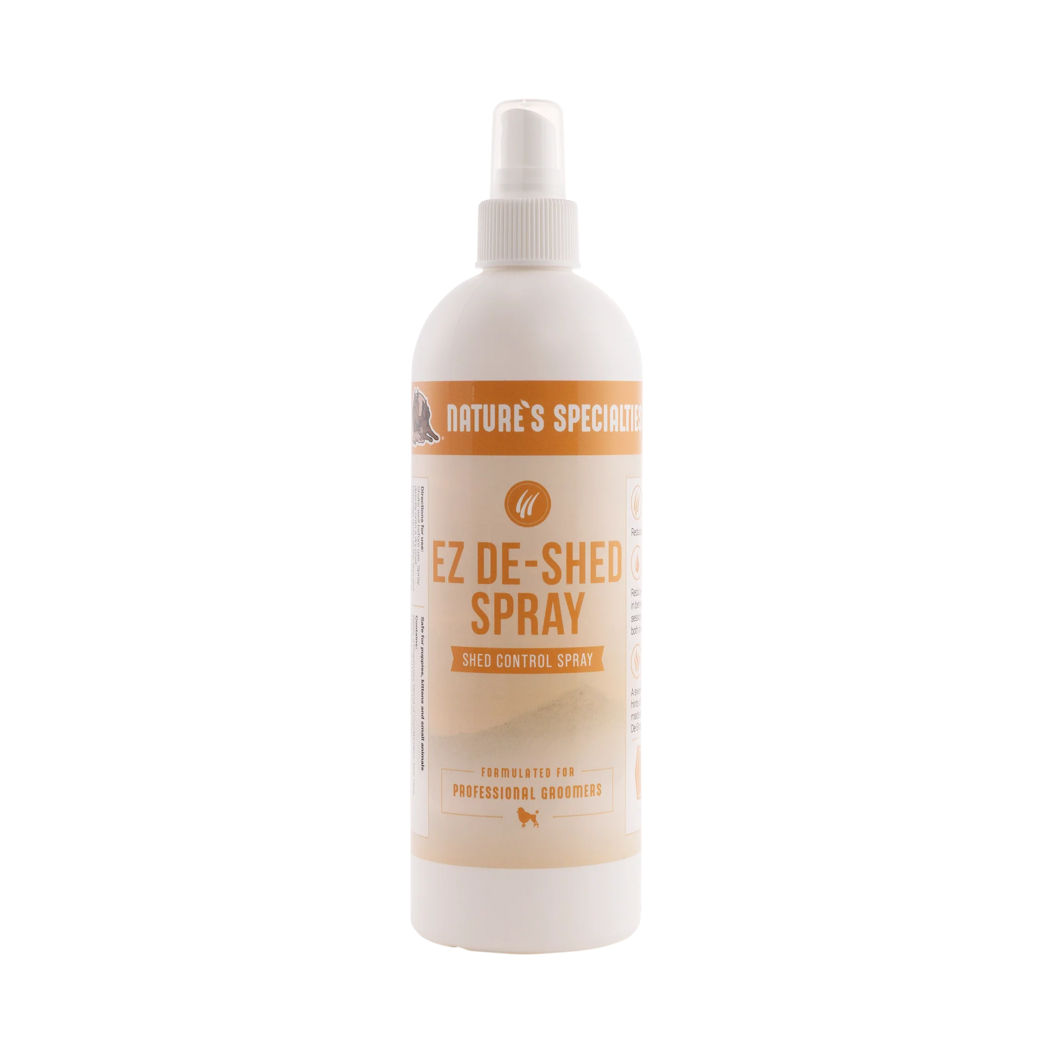 Nature’s Specialties EZ De-Shed Spray is ontwikkeld als aanvulling op de best sellers EZ Out Shampoo en EZ Shed Conditioner en is een conditioningspray die je niet hoeft uit te spoelen en die het uitvallen van de vacht en verwarde vacht tussen reguliere bad- en verzorgingssessies verminderd, terwijl het ook de vacht voedt en een gezonde glans bevordert. De De-Shed Spray is verrijkt met vochtinbrengende conditioners en Aloë Vera en ondersteunt een gezonde huid en vacht, door een levendige en stralende glans en zachtheid te geven. Ook super als afwerking na een trimbeurt.