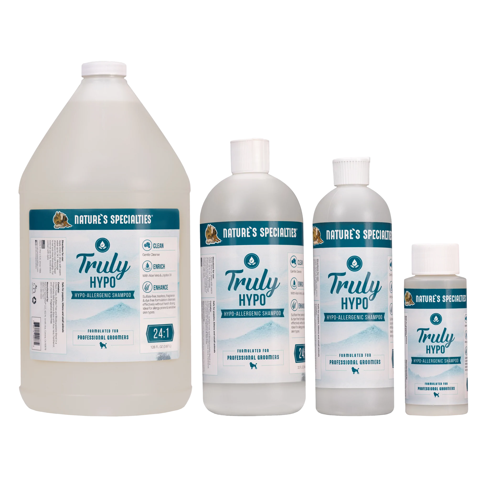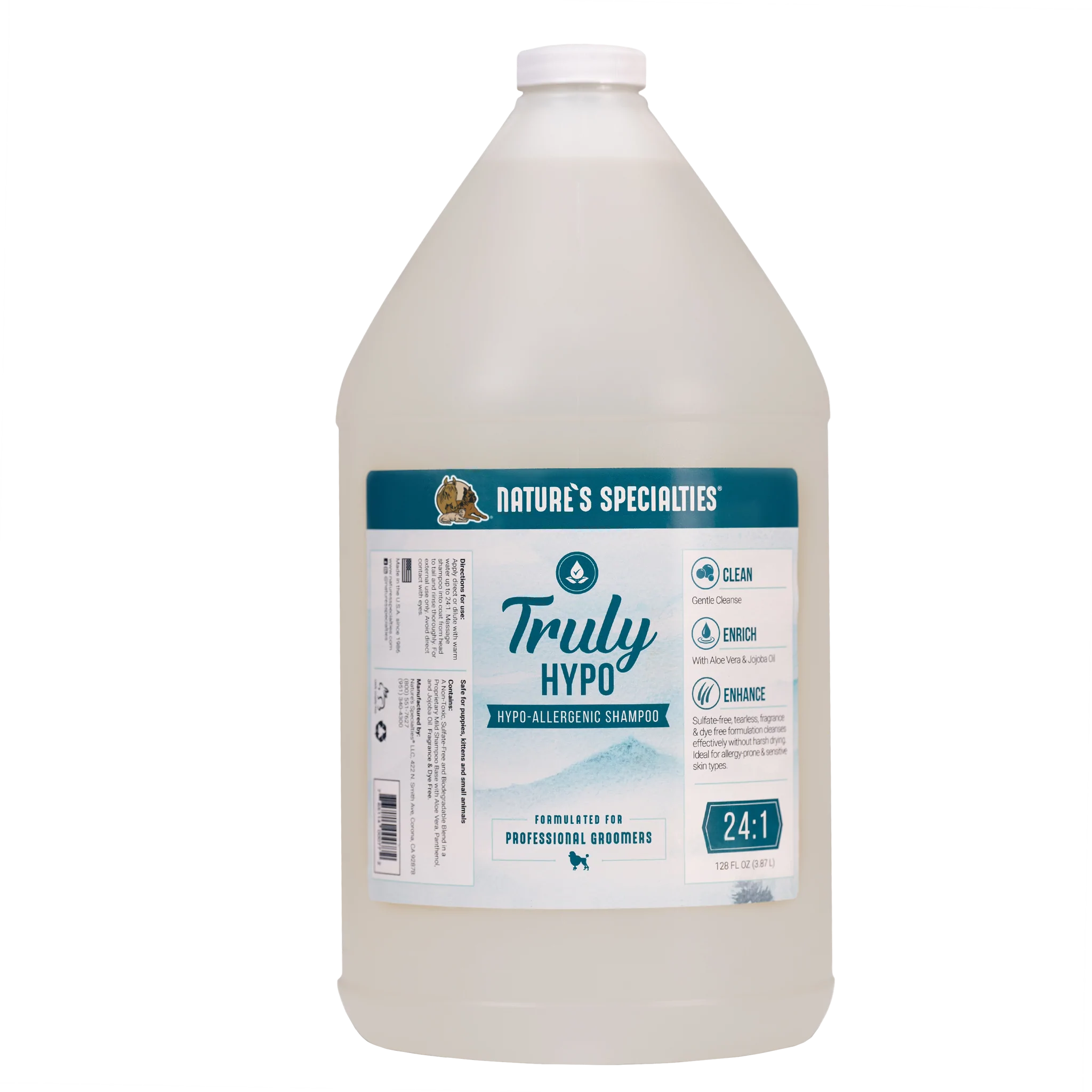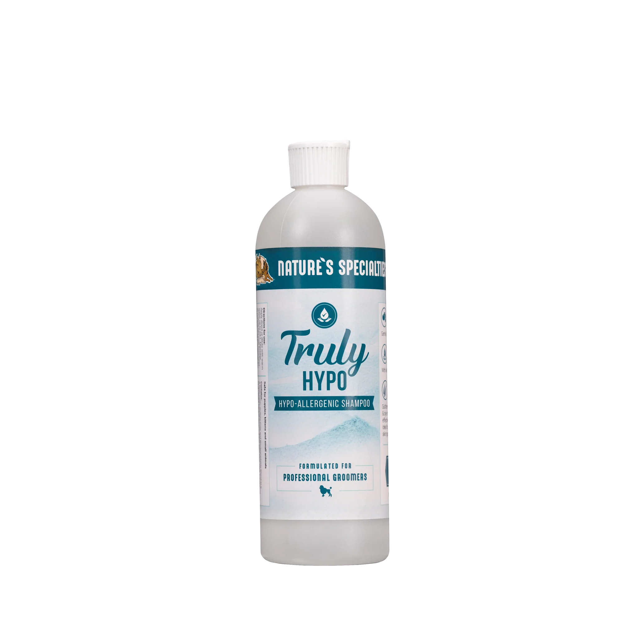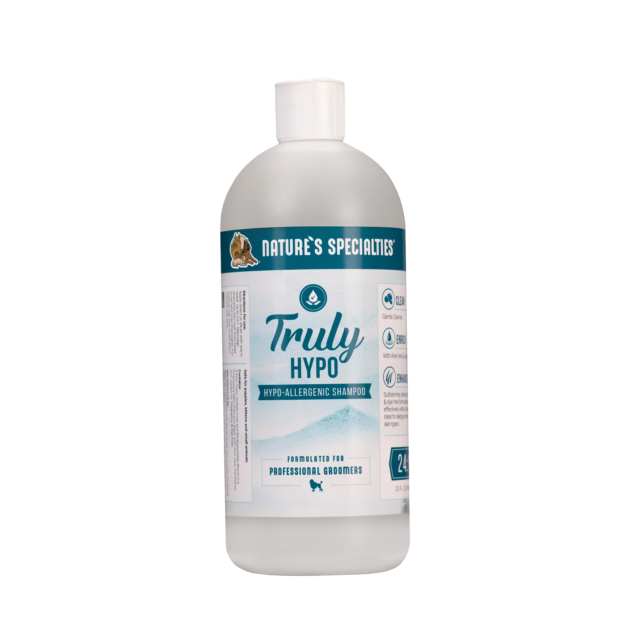 Nature’s Specialties Truly Hypo Shampoo is gemaakt met een milde, biologisch afbreekbare mix van oppervlakteactieve stoffen die zorgt voor een diepe reiniging en zacht genoeg is om irritatie bij huisdieren met een gevoelige huid te voorkomen. Deze traanloze, sulfaatvrije, parabenenvrije, geur- en kleurstofvrije formulering verwijdert voorzichtig vuil, overtollige olie en productophoping om de vacht zacht en schoon te maken, zonder hard uit te drogen. Toegevoegde Jojoba-olie hydrateert de huid om huidschilfers te voorkomen en dofheid in de vacht te verminderen.